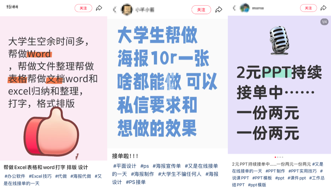 “领导要求一周内上交一套产品推广文案,我每天光是做必要本职工作就经常加班到晚上9点以后,根本没有时间和精力独立完成。”在北京某公司任职的赵晴(化名)向记者展示了手机里的聊天记录:凌晨1点,她通过某二手交易平台联系到一名大学生,以500元的价格将产品推广文案“转包”给了对方。